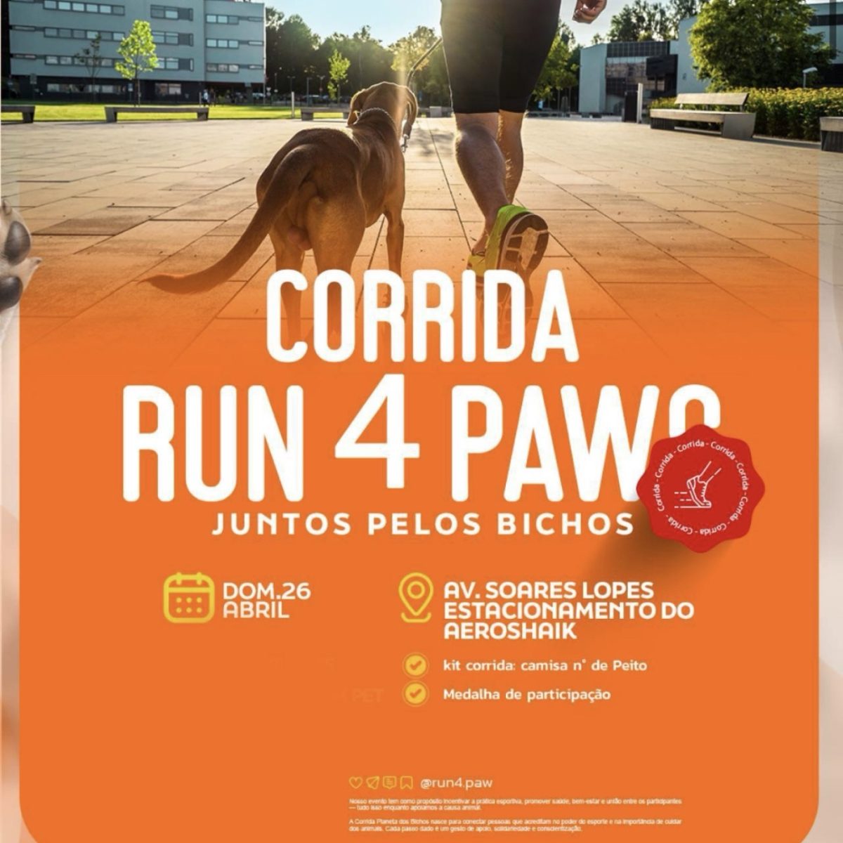 A Run 4 Paws integra a campanha Abril Laranja, que busca alertar a população sobre os maus-tratos contra animais, incentivar a denúncia e promover a guarda responsável. O evento conta com o apoio de parceiros como Vittamax, PlayLuz e Calzin.