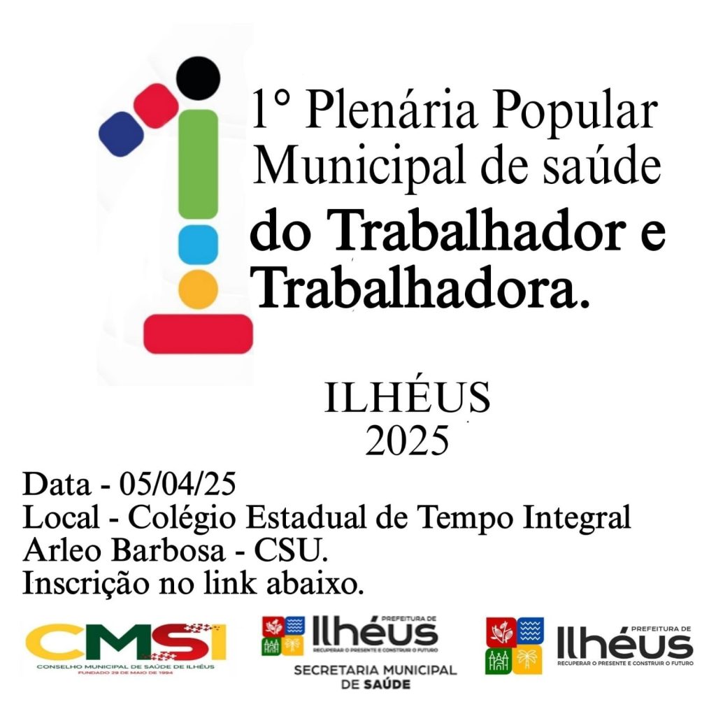 No próximo sábado, dia 5 de abril, Ilhéus sediará a 1ª Plenária Municipal de Saúde do Trabalhador e Trabalhadora, um evento fundamental para o fortalecimento das políticas públicas voltadas à saúde laboral. A atividade ocorrerá das 8h às 17h, no Colégio Estadual de Tempo Integral Arleo Barbosa, no CSU, reunindo trabalhadores, gestores públicos, especialistas e representantes do Conselho Municipal de Saúde.