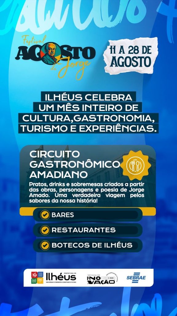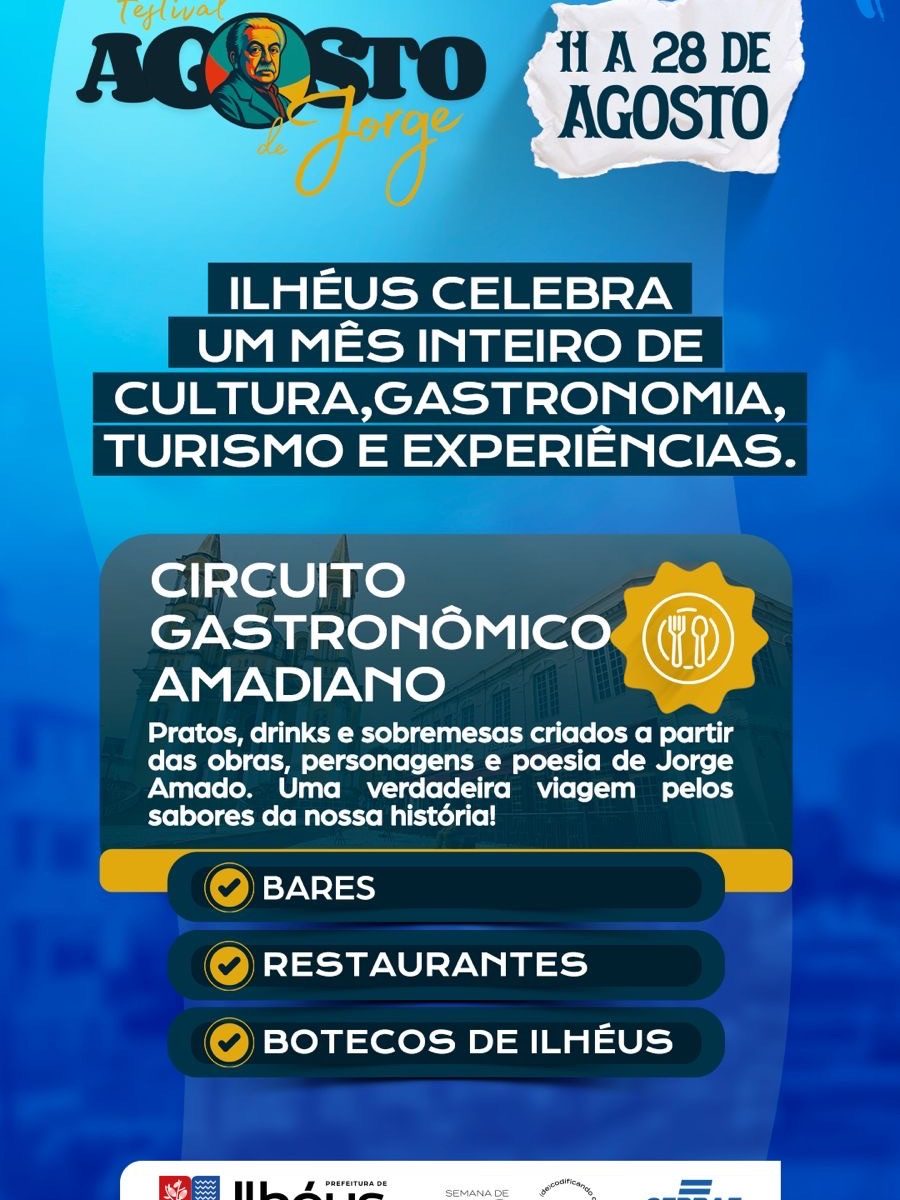 A abertura oficial será nesta segunda-feira (11), às 18h, no Centro de Convenções, com o espetáculo “CACAU – Memórias com Cheiro de Chocolate”, que aborda a trajetória da cidade a partir da cultura cacaueira. Entre os destaques está o Circuito Gastronômico “A Gosto de Jorge”, realizado entre os dias 11 e 28 de agosto, com cardápios inspirados nas obras do autor em diversos restaurantes e bares da cidade.