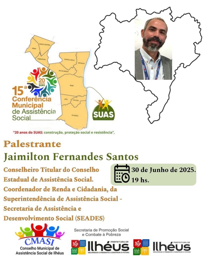 A Prefeitura de Ilhéus, por meio da Secretaria Municipal de Promoção Social e Combate à Pobreza, realiza a XV Conferência Municipal de Assistência Social nos dias 30 de junho e 1º de julho, no Colégio Estadual Arléo Barbosa (CSU). As inscrições podem ser feitas até esta quinta-feira, 26 de junho, às 23h59. A realização é do Conselho Municipal de Assistência Social (CMAS), com participação de representantes do poder público e da sociedade civil.