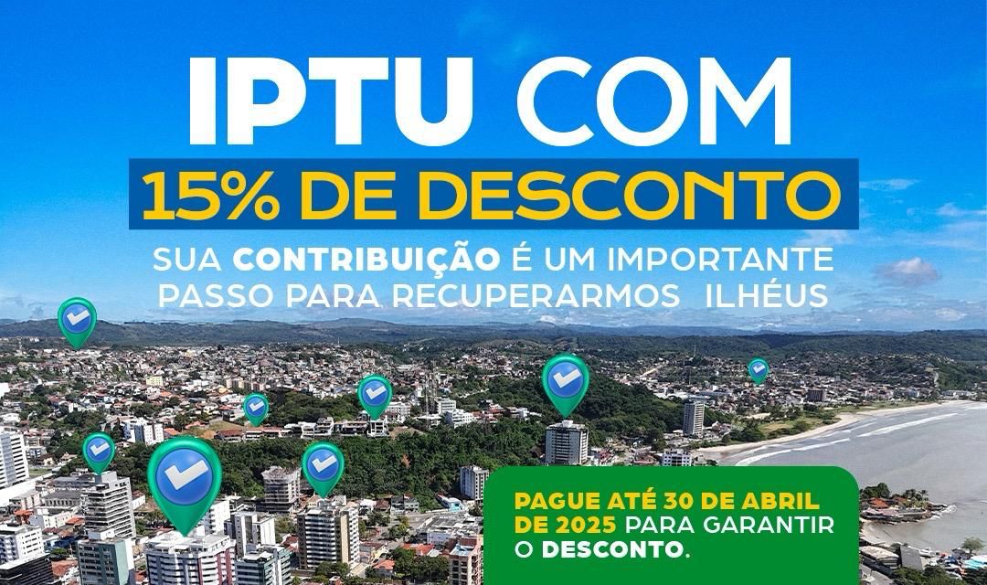 A Prefeitura de Ilhéus informa que os contribuintes têm até esta quarta-feira, dia 30 de abril, para pagar o Imposto Predial e Territorial Urbano (IPTU) em cota única com 15% de desconto. A iniciativa tem como objetivo estimular a quitação antecipada do tributo e facilitar o acesso ao carnê por diferentes canais de atendimento.
