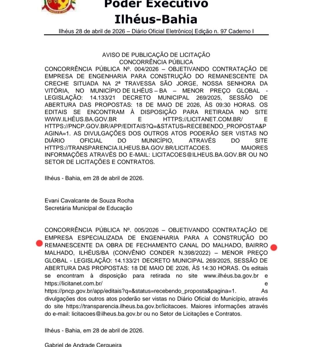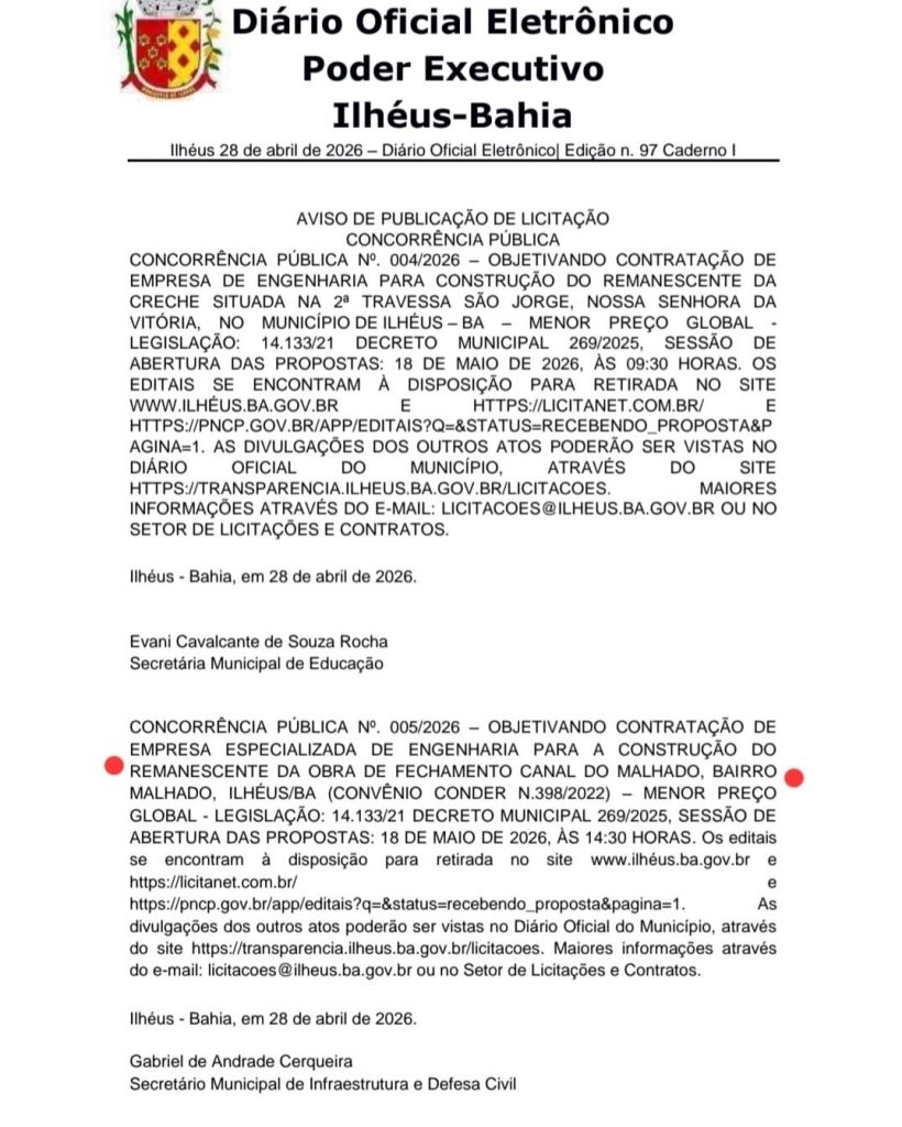 Já a Concorrência Pública nº 005/2026 trata da contratação de empresa especializada para a construção do remanescente da obra de fechamento do Canal do Malhado, no bairro Malhado, vinculada ao Convênio CONDER nº 398/2022. Neste caso, a sessão de abertura das propostas ocorrerá também no dia 18 de maio de 2026, às 14h30.