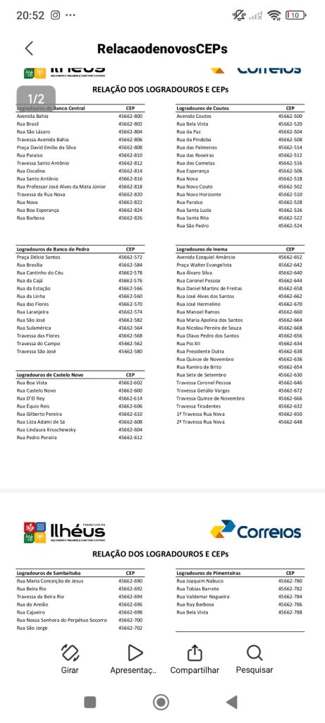 A Prefeitura de Ilhéus, por meio da Secretaria de Desenvolvimento Econômico e Inovação, solicitou e obteve junto à Empresa Brasileira de Correios e Telégrafos a criação de novas faixas de Código de Endereçamento Postal (CEP) para 124 logradouros das sedes distritais e do povoado de São José. A partir do dia 30 de abril, cada rua das localidades de Banco Central, Banco do Pedro, Castelo Novo, Coutos, Inema, Japu, Pimenteiras, Sambaituba e Distrito Ilhéus (Sede) contará com um CEP individual.