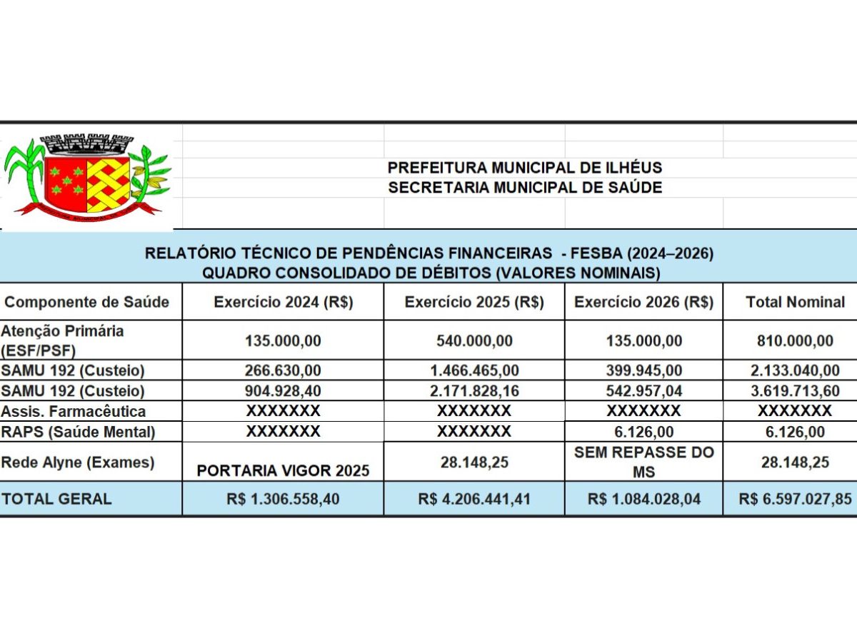 A Prefeitura de Ilhéus, por meio da Secretaria Municipal de Saúde, confirma atrasos em repasses do Governo do Estado da Bahia que somam R$ 6.597.027,85, impactando diretamente a assistência à população.