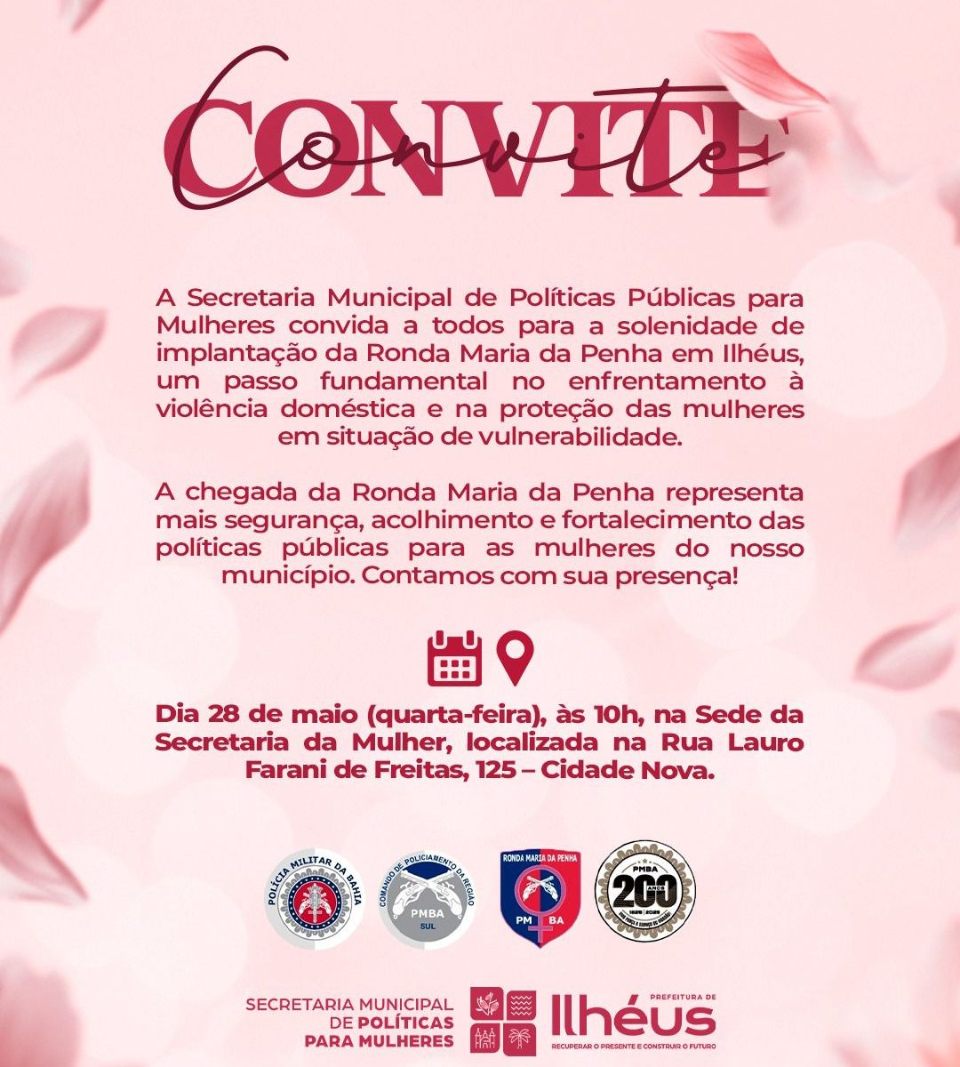 A Prefeitura de Ilhéus, por meio da Secretaria Municipal de Políticas para Mulheres, convida toda a população para a solenidade de implantação da Ronda Maria da Penha no município. O evento será realizado nesta quarta-feira (28), às 10h, na sede da Secretaria da Mulher, localizada na Rua Lauro Farani de Freitas, 125, no bairro Cidade Nova.
