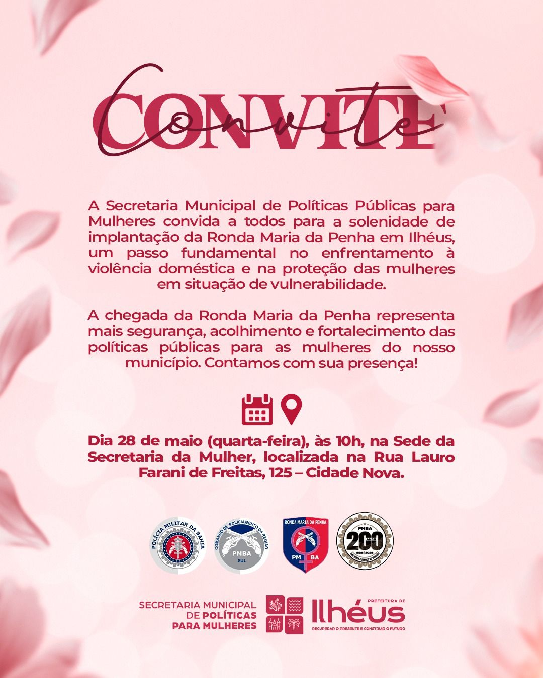 A Prefeitura de Ilhéus, por meio da Secretaria Municipal de Políticas para Mulheres, convida toda a população para a solenidade de implantação da Ronda Maria da Penha no município. O evento será realizado nesta quarta-feira (28), às 10h, na sede da Secretaria da Mulher, localizada na Rua Lauro Farani de Freitas, 125, no bairro Cidade Nova.