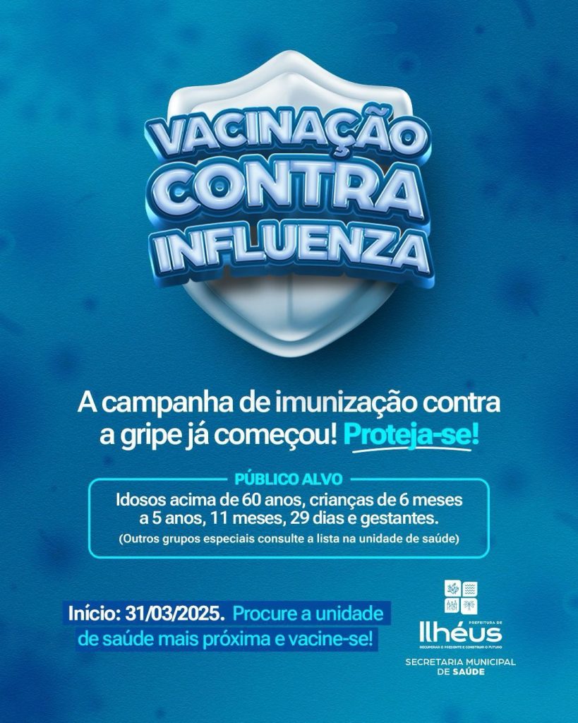 A Prefeitura de Ilhéus, através da Secretaria de Saúde, iniciou nessa segunda-feira (31) a Estratégia de Vacinação contra a Influenza (trivalente), antecipando a imunização dos grupos prioritários antes do início oficial da campanha nacional, previsto para 7 de abril. A medida busca ampliar a proteção da população contra a gripe, especialmente diante do risco contínuo representado tanto pela Influenza quanto pela Covid-19.