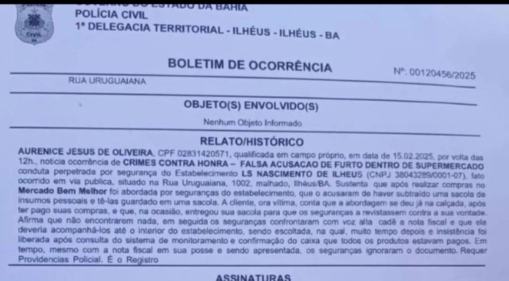 Na cidade de Ilhéus, sul da Bahia, mais um caso de constrangimento e desrespeito à dignidade humana vai parar na Justiça. A senhora Eurenice Jesus Oliveira, de 56 anos, decidiu acionar judicialmente o Supermercado Bem Melhor após ser acusada, de forma injusta, de furto dentro do estabelecimento.