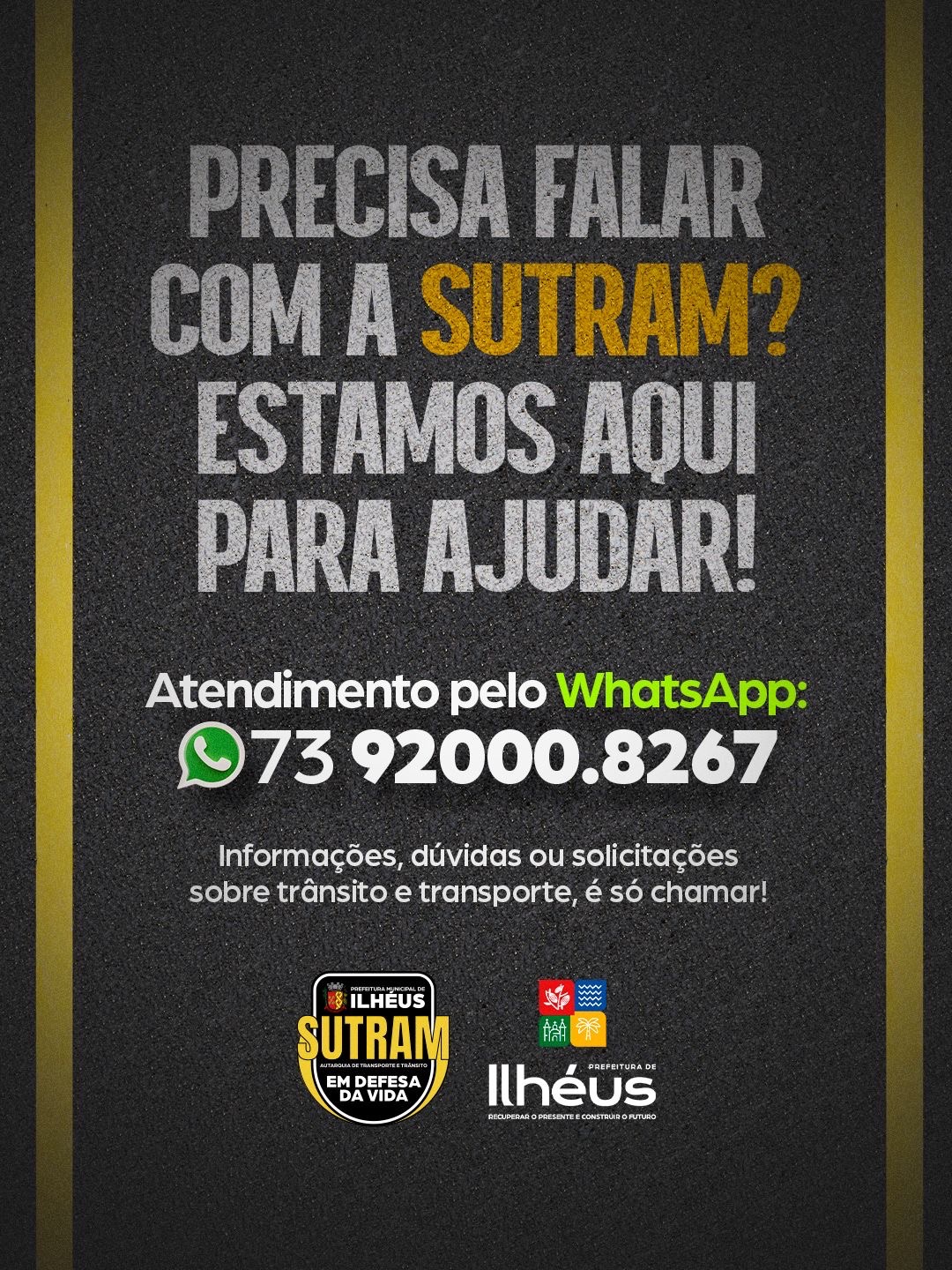 A Prefeitura de Ilhéus, por meio da Autarquia de Transporte e Trânsito (SUTRAM), informa à população o canal oficial de atendimento via WhatsApp para assuntos de trânsito. Através do número (73) 92000-8267, a SUTRAM está à disposição para esclarecer dúvidas, receber sugestões, registrar ocorrências relacionadas ao transporte e trânsito, além de oferecer orientações aos cidadãos.